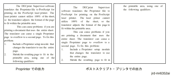 Proprinterファイルを作成するアプリケーションでは,ページ全体を印刷のために使用できことを想定しています。Proprinter 装置などのドット・ マトリクス・プリンタでは,ページ全体が使用されます。一方,DECprint Supervisor for OpenVMS ソフトウェアでサポートされるレーザ・ プリンタでは,印刷可能領域はページ全体より小さく, 印刷可能領域の周囲に余白が残されています。