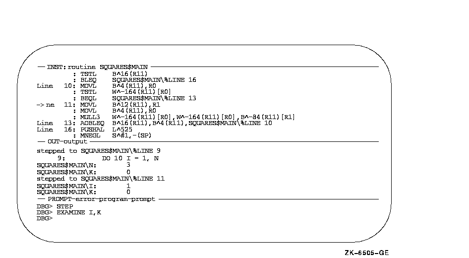 機械語命令ディスプレイは,ルーチンの命令ストリーム内にあるEXAMINE /INSTRUCTIONコマンドの出力を表示します。表示される命令はデバッグされているイメージからデコードされたものであり, 実行されているコードを正確に示しているので, この種のディスプレイは最適化されたコードをデバッグするのに特に役立ちます( 第14.1 節を参照)。