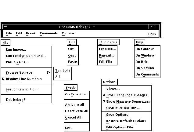 OpenVMSデバッガでは,ワークステーション用にDECwindows Motifグラフィカル・ ユーザ・インタフェース(GUI)を使用できます。このインタフェースは画面モード・ コマンド・インタフェースの拡張機能であり,マウスを使用してメニューから項目を選択したり, プッシュ・ボタンを有効または無効に設定したり, ポインタをドラッグしてウィンドウ内のテキストを選択できます。 デバッガのDECwindows Motif GUIメニューとプッシュ・ボタンを使用すると, 基本的なほとんどのデバッグ作業を実行できます。