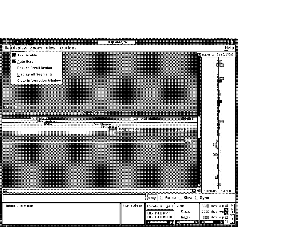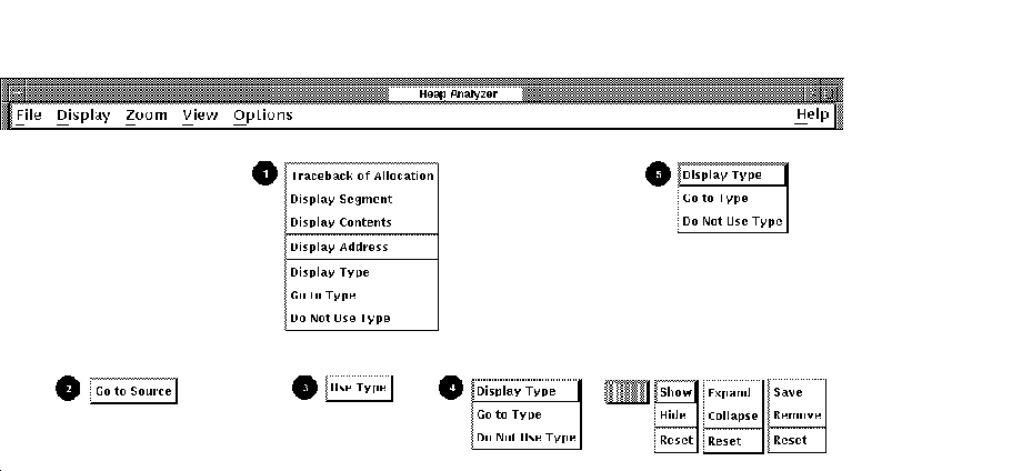 ヒープ・アナライザの「Memory Map」の上には5つのプルダウン・メニューがあります( 図 12-2を参照)。メニュー項目をすべて示すために, この図は少し修正してあります。