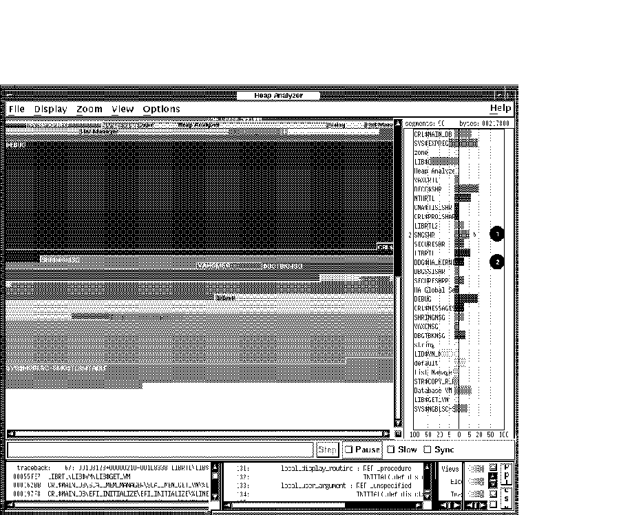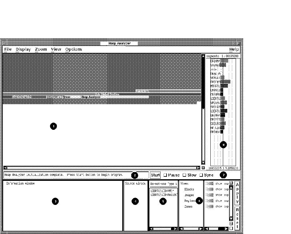 ヒープ・アナライザには,メイン・ウィンドウ,6つの補助ウィンドウ, およびコントロール・パネルがあります(図 12-1 を参照)。