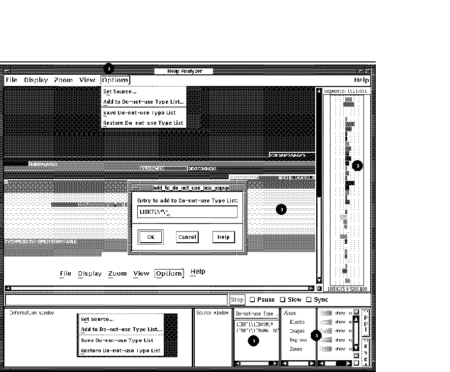 セグメント・タイプ名を「Do-not-use Type」リストに追加するには,プルダウンの「Options 」メニューから「Add to Do-not-use Type List」を選択するか, または「Memory Map」,「Type」ヒストグラム,および「Views-and-Types 」ディスプレイの各ポップアップ・メニューで「Do Not Use Type」を選択します。「Do-not-use Type」リストからセグメント・ タイプを削除するには,「Do-not-use Type」リストのポップアップ・ メニューで「Use Type」を選択します。