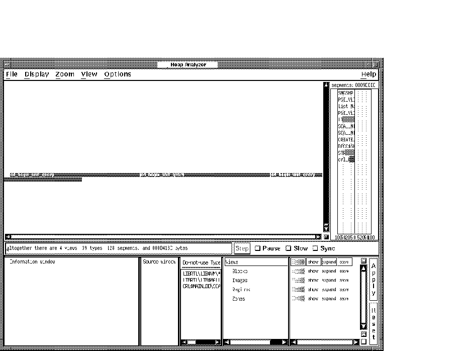 各メモリ・マネージャが認識している個々のセグメント・タイプを表示するには, 「Blocks」,「Images」,「Regions」,「Zones」の各キーワードをMB1 でダブル・クリックして,省略時設定の表示を拡大します。それぞれの表示を元に戻すには, 前に選択したキーワードをMB3でクリックします。
