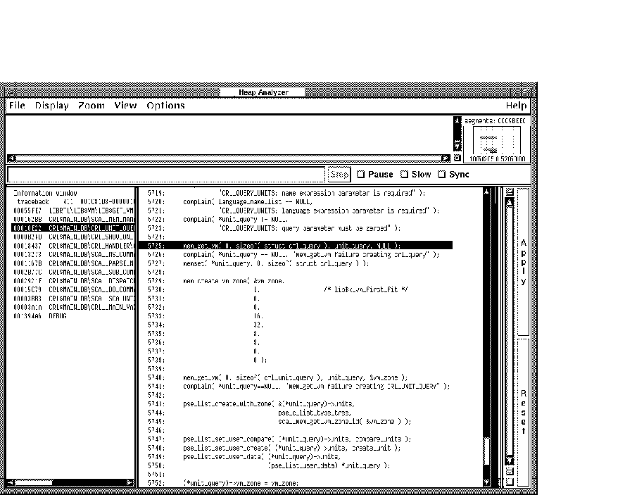 問題点を個々の割り当てにまで絞りこんだ後は,トレースバック情報を表示できます。 ヒープ・アナライザでは,割り当てのトレースバック・エントリをアプリケーション・ プログラムのソース・コードと相互に対応させることができます。 それからソース・コード・ディスプレイをスクロールして調べていけば, 問題のあるコードを特定でき,どう修正したらいいかを決定することができます。