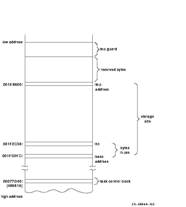 このときタイム・スライスASTかその他のASTが発生すると,別のタスクの実行が再開し, しばらくの間は正常でないままプログラムが続行することがあります。 スタックがオーバフローしたタスクは,メイン・プログラムのスタックを使用し, 重ね書きすることがあります。デバッガのスタック・ チェックは,このような状態を検出するのに役立ちます。オペレーティング・ システムによってスタックの規定外の箇所に書き込みをされたタスク内の命令をステップ実行すれば, またはそのときにSHOW TASK/ALLコマンドを使用すれば, デバッガからスタック・アンダフロー・メッセージが発行されます。
