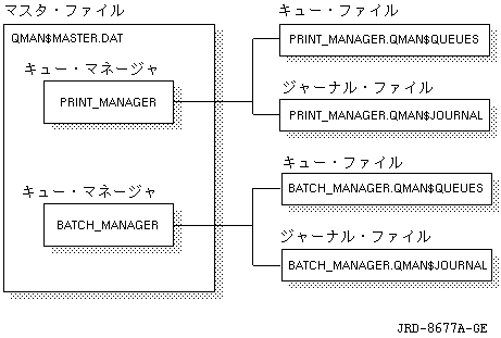 キュー・データベースは,キュー・システムが動作しつづけるために必要な, ジョブ,キュー,キュー・マネージャなどの情報を保持します。1つの省略時のキュー・ マネージャSYS$QUEUE_MANAGERに対するキュー・データベースを構成するファイルは次のとおりです。