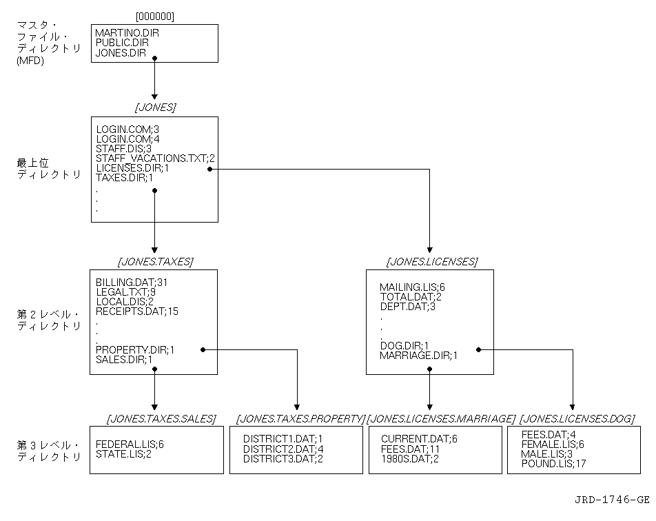 たとえば,[JONES]の中のファイルを表示する場合には,次のように入力します。 この例では,[JONES]の中に2つのサブディレクトリ([JONES.LICENSES] と[JONES.TAXES])と4つの非ディレクトリ・ファイル(STAFF.DIS ,STAFF_VACATIONS.TXT,およびLOGIN.COMの2つのバージョン) が入っています。