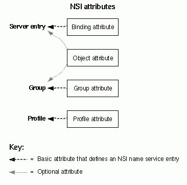 Usually, the distinct server entries, groups, and profiles concepts are adequate for using NSI. However, the way NSI stores RPC information allows you to combine server entries, groups, and profiles into a single directory service entry. To store information about RPC applications in a directory service entry, the RPC directory service interface defines several RPC-specific directory service attributes, or NSI attributes. NSI attributes contain information about RPC applications in a directory service entry. The NSI attributes are as follows: