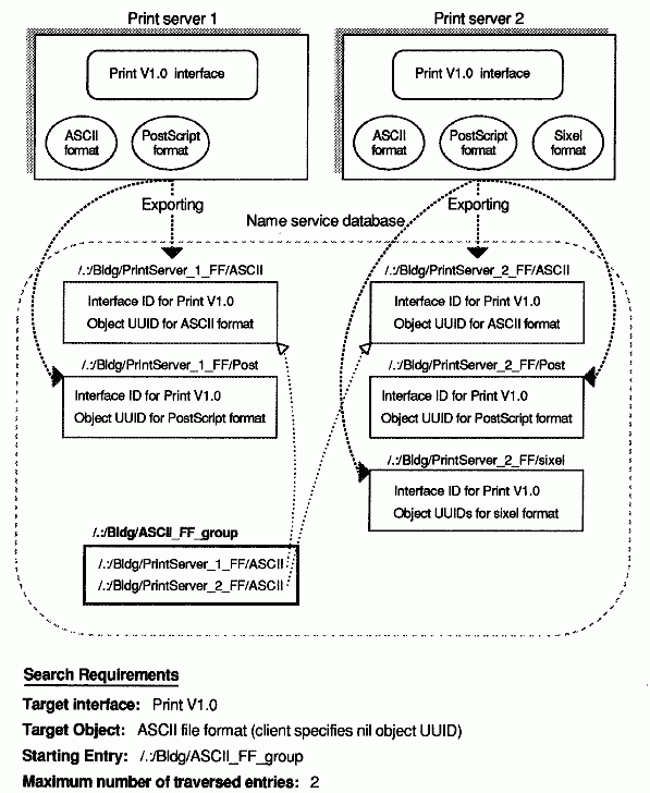 For some applications, however, you can use a separate server entry for each object UUID; for example, a print server application that supports a small number of file formats. Each server can create a separate server entry for each supported file format and export its object UUID to that server entry. The server entries for a file format are members of a distinct group.