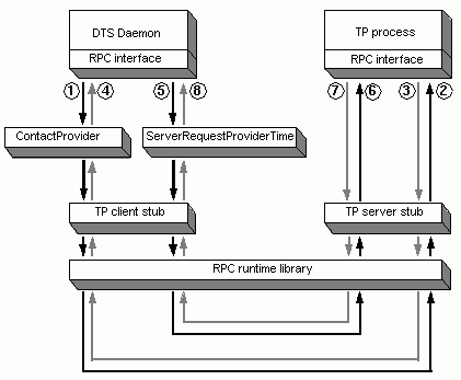 5. DTS then calls the ServerRequestProviderTime remote procedure. Input parameters are passed to the TP client stub, dispatched to the RPC runtime library, and then passed to the TP server stub.