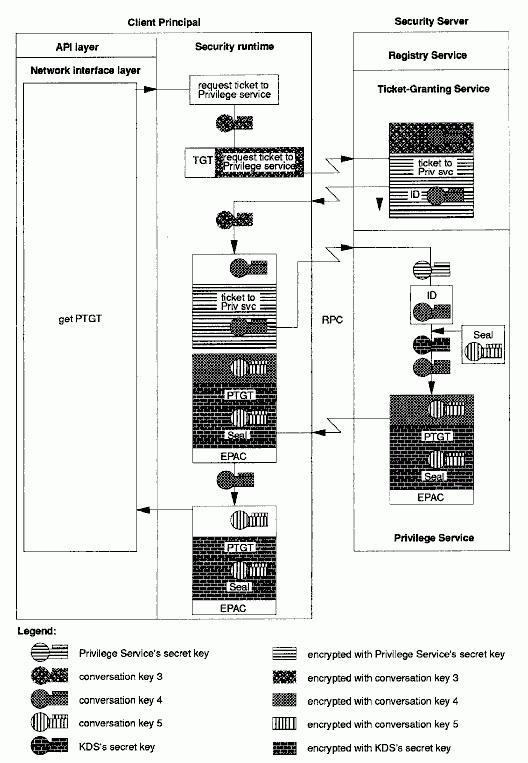 The EPAC describes the user's privilege attributes (identity information and group membership) and any extended attributes that are associated with the user - all represented as UUIDs (not strings). The EPAC (or EPAC chain, in case of a delegated operation) is sealed with an MD5 checksum. (Delegation is described in The Extended Privilege Attribute API .) The privilege service constructs a PTGT, which is a ticket that contains the EPAC, the EPAC seal, another copy of the EPAC seal encrypted in the secret key of the privilege service (this is called a delegation token), and a conversation key 5 (which is actually generated by the KDS, though the illustration doesn't show this detail). All this information except for the EPAC itself is encrypted in the secret key of the KDS (thus, the delegation token is doubly encrypted). (The KDS and privilege service cooperate to prepare the PTGT, although the illustration only shows the privilege service preparing it.) The EPAC seal inside the PTGT binds the EPAC to the PTGT, guaranteeing its integrity even though it is not encrypted. The conversation key 5 is encrypted in conversation key 4, and all this data is returned to the client.