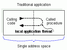 Traditional processing occurs exclusively within local application threads. Local application threads execute within the confines of one address space on a local system and pass control exclusively among local code segments, as illustrated in the following figure.