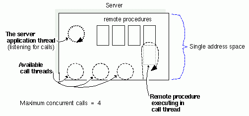 In addition, for executing called remote procedures, an RPC server uses one or more call threads that the RPC runtime provides. As part of initiating listening, the server application thread specifies the maximum number of concurrent calls it will execute. The maximum number of call threads in multithreaded applications depends on the design of the application. The RPC runtime creates the same number of call threads in the server process.