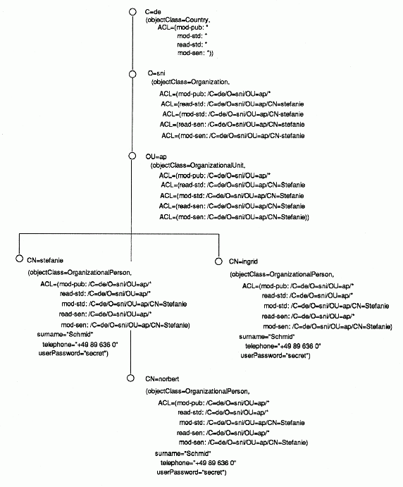 These steps are demonstrated in the following code fragments from acl.h. The program includes a search operation. In order to perform the operation, the program assumes the directory contains the subtree shown in the following figure.