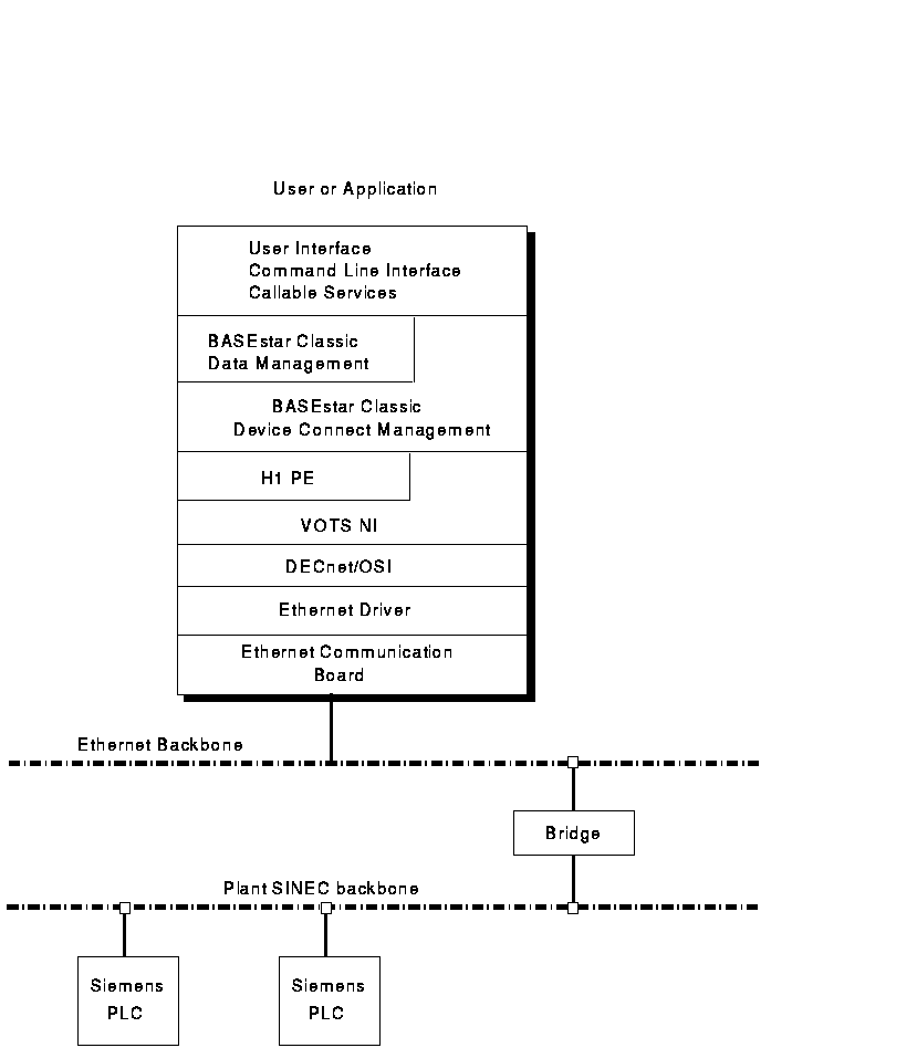 The DAS for Siemens H1 Protocol must be installed on an OpenVMS host that is connected to Siemens programmable controllers using an Ethernet backbone. Optionally, one may introduce an Ethernet bridge to separate the Ethernet traffic in the computer room from the Ethernet traffic on the plant floor. The OpenVMS host and the programmable controller communicate using the first four layers of the ISO/OSI standard. On the OpenVMS side this is done using the OSI Transport Services application programming interface.