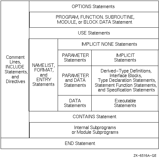 Figure 2-1 shows the required order of statements in a Fortran program unit. In this figure, vertical lines separate statement types that can be interspersed. For example, you can intersperse DATA statements with executable constructs.