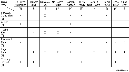 The two characters from the FILE STATUS data item combine to form a file status value. The first character (Status Key 1), which occupies the leftmost character position in the item, represents a specific class of I/O operation (0--success, 1--at end, 2--invalid key, 3--permanent error, 4--logic error, or 9--Compaq defined). The second character (Status Key 2), which occupies the rightmost position, provides additional information about the result of an I/O operation. In combination, Status Key 1 and Status Key 2 indicate the status of an I/O operation. For example, if you are interested in duplicate keys, you check for File Status 02.