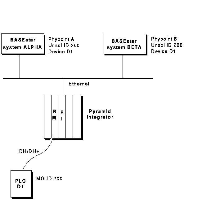 Figure 3-2 illustrates an invalid unsolicited configuration. Here both BASEstar Classic systems are attempting to use the same unsolicited ID (that both phypoints are on the same device is irrelevant). This is an invalid configuration because both BASEstar Classic systems need to route through the same Ethernet Interface module to access the unsolicited data.
