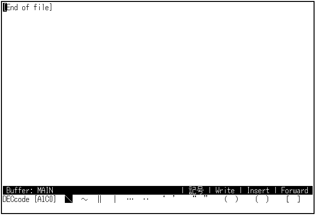 記号を入力するモードです。画面の下のほうにDEC漢字コード一覧表が表示され, 矢印キー([↑],[↓],[→],[←])で上下左右にカーソルを移動します。 [Return]キーを押すと,カーソルが置かれている記号を現在のバッファに入力できます。 記号モードを終了してローマ字漢字/カナ漢字モードに戻るには, [F10]キーを押してください。