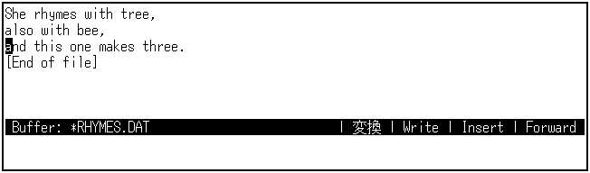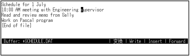 日本語EVEは,カーソルをバッファの先頭に移動し, ユーザがテキストを入力するのを待ちます。次に示すテキストを SCHEDULE.DATファイルに入力すると, [End of file]マーカはバッファ内で下に移動します。