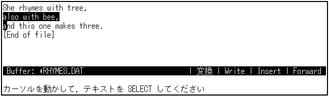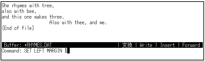 短縮形を区別できる十分な文字をタイプし,[Return]キーを押すと, そのコマンドが実行されます。また,バッファ名,ファイル名, および MARK コマンドのラベル名も,同様に省略することができます。 これらの場合も,短縮形があいまいなときには, 日本語EVEは対応するもののリストを表示します。
