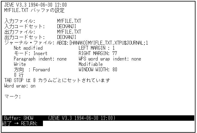 バッファの現在の属性を表示するには,SHOW DEFAUTLS BUFFER コマンドを 入力します。日本語EVEは,図 7-11の情報を表示します。