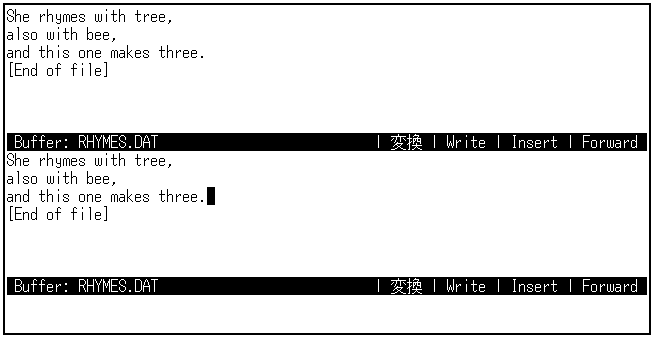 キーボードから文字をタイプ入力できます。日本語EVEは, バッファの現在のモード(挿入モード/重ね書きモード)にしたがって, バッファの現在のカーソルの位置に文字を追加します。