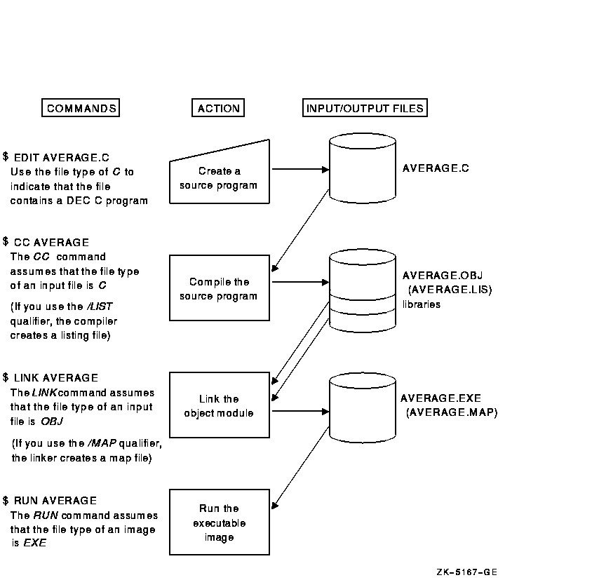 To create a DEC C source program at DCL level, you must invoke a text editor. In Figure 1-1, the EDIT command invokes the default editor EDT to create the source program AVERAGE.C. You can use another editor, such as the DEC Text Processing Utility (DECTPU) or the DIGITAL Language-Sensitive Editor (LSE). (LSE is a product that must be purchased separately; see Appendix C for more information.) A file type of C is used to indicate that you are creating a DEC C source program. C is the conventional file type for all DEC C source programs.