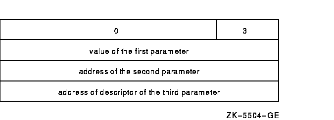 The argument list contains the parameters that are passed to the routine. Depending on the passing mechanisms for these parameters, the forms of the arguments contained in the argument list vary. For example, if you pass three arguments, the first by value, the second by reference, and the third by descriptor, the argument list would contain the value of the first argument, the address of the second, and the address of the descriptor of the third. Figure 3-3 shows this argument list.