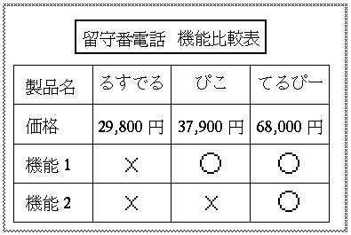 2行あけて,3行目にタイトルを入力します。 2行あけるのは,後で箱を書くためです。まず,"留守番電話"と入力し, 2カラム移動して"機能比較表"と入力します。確定したら, [Return]キーを3回押して,製品名の行との間に2行あけます。2行あけるのは, 後で箱を書くためです。