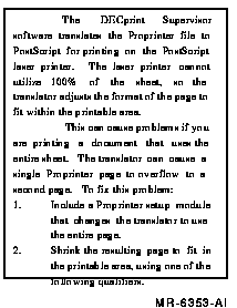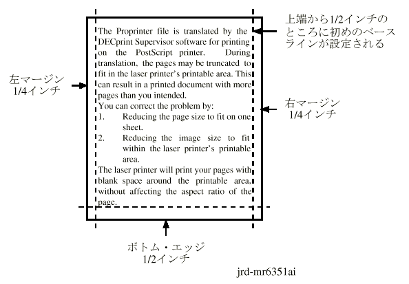 Proprinterファイルを作成するアプリケーションでは,ページ全体を印刷のために使用できことを想定しています。Proprinter 装置などのドット・ マトリクス・プリンタでは,ページ全体が使用されます。一方,DECprint Supervisor for OpenVMS ソフトウェアでサポートされるレーザ・ プリンタでは,印刷可能領域はページ全体より小さく, 印刷可能領域の周囲に余白が残されています。