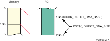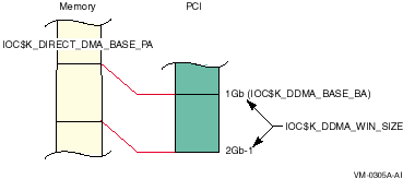 IOC$K_DIRECT_DMA_BASE_PAコードを使用して返されるアドレスは,オフセットを計算するのに必要です( これは通常,メモリPAとバス・アドレスの間の1 GB の差として使用されます)。オフセットは,ベース・バス・アドレスとベース・ メモリ・アドレスの間の符号付きの差として定義されます。 これは必ずしも1 GBではありません。