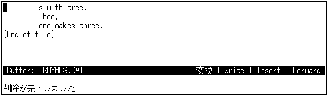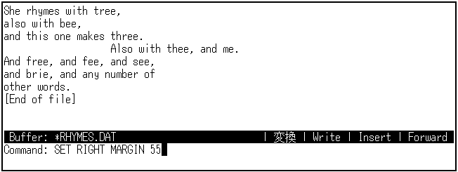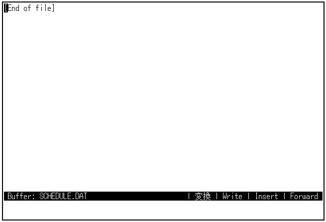 日本語EVEは,カーソルをバッファの先頭に移動し, ユーザがテキストを入力するのを待ちます。 次に示すテキストをSCHEDULE.DATファイルに入力すると, [End of file]マーカはバッファ内で下に移動します。