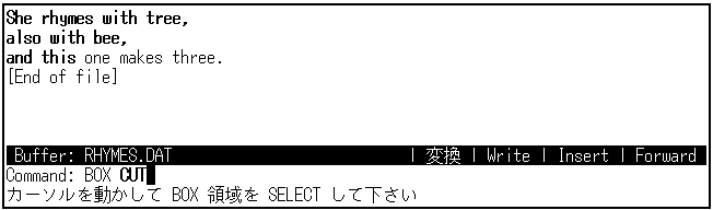 短縮形を区別できる十分な文字をタイプし,[Return]キーを押すと, そのコマンドが実行されます。また,バッファ名,ファイル名, および MARK コマンドのラベル名も,同様に省略することができます。 これらの場合も,短縮形があいまいなときには, 日本語EVEは対応するもののリストを表示します。