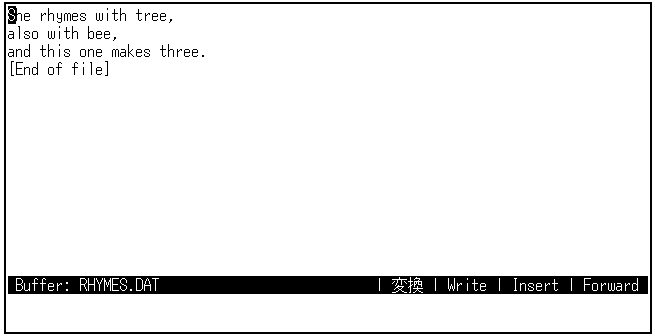 キーボードから文字をタイプ入力できます。 日本語EVEは,バッファの現在のモード(挿入モード/重ね書きモード)にしたがって, バッファの現在のカーソルの位置に文字を追加します。