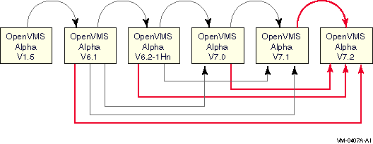 OpenVMS Alphaの場合,バージョン6.1,バージョン6.2,バージョン7.0, バージョン7.1からバージョン7.2に直接アップグレードできます。クラスタのローリング・ アップグレードはバージョン6.2とバージョン7.1からサポートされます。 図 1-1はOpenVMS Alphaのアップグレード・ パスを示しています。