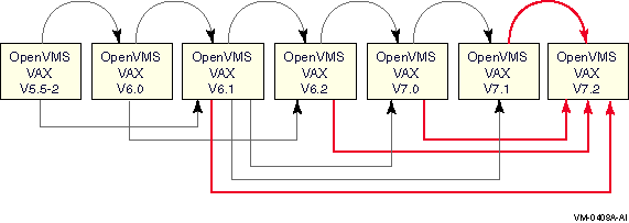 クラスタのローリング・アップグレードは,バージョン6.2およびバージョン7.1 からサポートされます。図 1-2はOpenVMS VAX のアップクレード・パスを示しています。