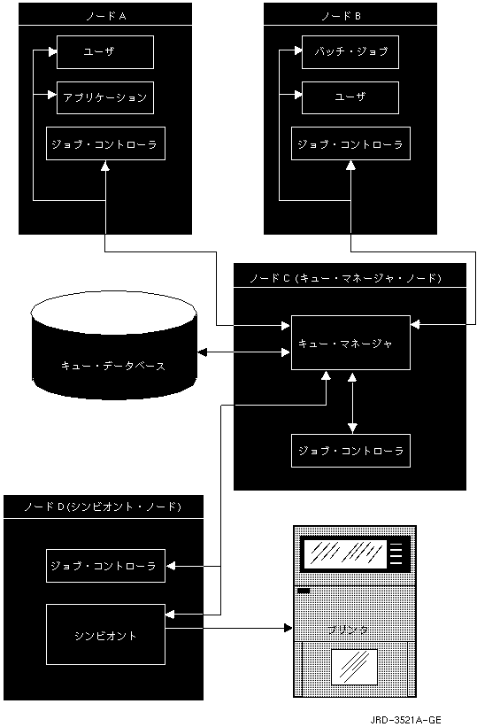 OpenVMS Cluster環境においてキューを管理するときのキュー・マネージャの働きを 図 12-1 に示します。
