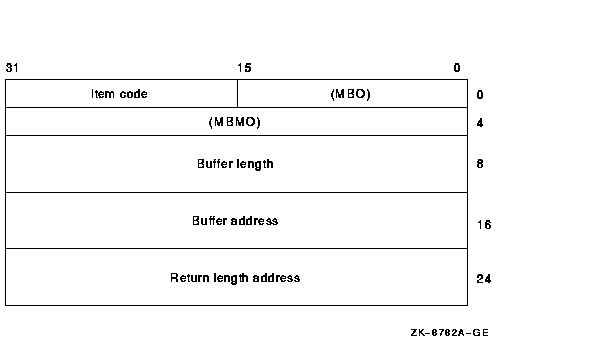 Item list specifying information about the event source or the event. The itmlst argument is the 64-bit address of a list of item descriptors, each of which describes an item of information. An item list in 64-bit format is terminated by a quadword of 0.The following diagram shows the 64-bit format of a single item descriptor.