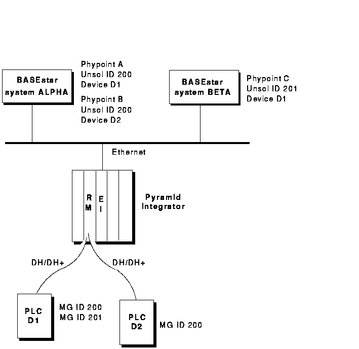 Figure 3-1 illustrates a valid unsolicited configuration. The BASEstar Classic system ALPHA has two unsolicited physical points with the same unsolicited ID of 200 octal. The configuration is valid only because the two physical points are on different devices and their format and sizes are identical. BASEstar Classic system BETA also has a physical point from device D1; because of the restriction, however, a different unsolicited ID must be used.