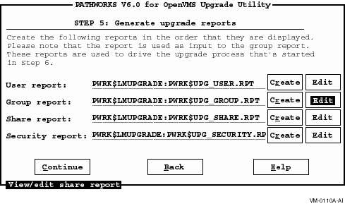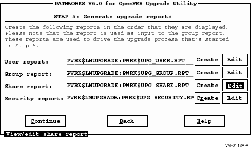 共有サービスレポートは LAN Manager 共有サービスファイルで PATHWORKS LAN Manager 共有サービスをリストアップします。 アップグレードはすべての PATHWORKS LAN Manager 共有サービスを PATHWORKS Advanced Server 共有サービスに変換します。 もしアップグレードしない共有サービスがあるなら、共有サービス名の前にバックスラッシュ(\)を加えるか、あるいはレポートから名前を削除してください。 共有サービスレポートの編集方法についての詳しい情報は、このガイドの Appendix B, Resolving Log File Error Messages を参照してください。 共有サービスレポートの編集を完了したら、エディタを終了してください。 システムは「Generate Upgrade Reports」画面に戻ります。 これでセキュリティレポートを作成または編集することができます。