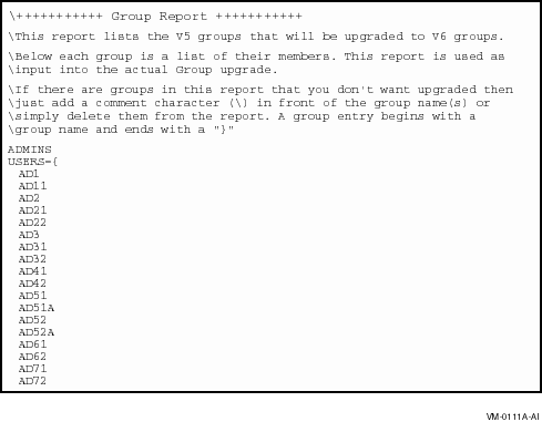 グループレポートは PATHWORKS Advanced Server グループにアップグレードされる PATHWORKS LAN Manager グループを示します。 下にそれぞれのグループがそのメンバーのリストです。 もしアップグレードしないグループがレポート中にあるなら、グループ名と 全ユーザの前にバックスラッシュ(\)を加えるか、あるいはレポートから名前を削除してください。 グループレポートの編集方法についての詳しい情報は、このガイドの Appendix B, Resolving Log File Error Messages を参照してください。