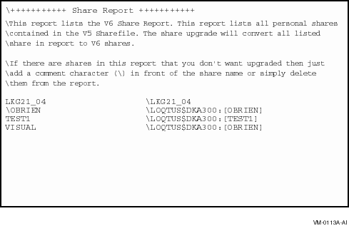 共有サービスレポートは LAN Manager 共有サービスファイルで PATHWORKS LAN Manager 共有サービスをリストアップします。 もしアップグレードしない共有サービスがレポート中にあるなら、共有サービス名の前にバックスラッシュ(\)を加えるか、あるいはレポートから名前を削除してください。 共有サービスレポートの編集方法についての詳しい情報は、このガイドの Appendix B, Resolving Log File Error Messages を参照してください。