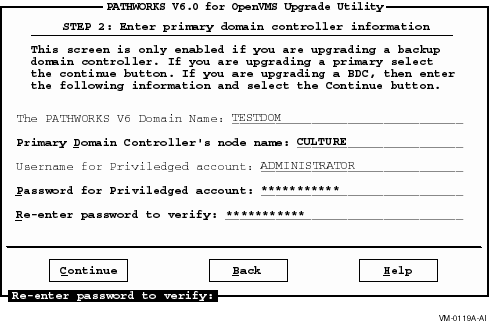 1. ドメインインフォメーション画面から、 Continue ボタンを選んでください。 アップグレードユーティリティは、以下の図に示されるように、「Primary Domain Controller Information」画面を示します。