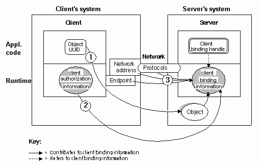 When making a remote procedure call, the client runtime provides information about the client to the server runtime. This information, known as client binding information, includes the following information: