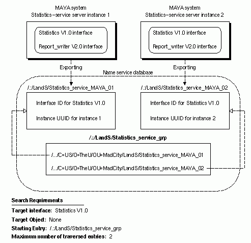 The following figure shows distinct instances of a statistics-service server on the same host. Each server instance uses an instance UUID to identify itself to clients. The instance UUID is the only object UUID a server instance exports to its server entry. Starting at the statistics-service group, clients import the statistics interface.