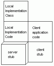 To accomplish this, you develop the client as if you are producing both a client and a server simultaneously. The only real difference is that you do not need any server initialization code. This means that your application includes the idl-generated manager class header and server stub, and manager implementation code for each interface. (See the following figure.) A client uses the client stub to produce and use remote objects. The client uses the server code to produce and use client-local objects of the interface class. This makes more sense when you think about server development: the manager class and code implement distributed objects of the interface class that are local to the server, so it helps to think local implementation code rather than server implementation code when we use server stubs, manager classes, and manager code in a client.If your application fails to use the server stub, the exception rpc_x_no_server_stub is raised by the client if your application tries to use local objects.