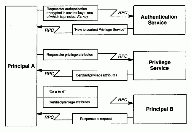 Had the authentication service been unable to decrypt the principal's authentication request, the principal would have been unauthenticated and, as a consequence, unable to acquire certified privilege attributes from the privilege service. In that case, Principal A might have simply asserted its privilege attributes to B; that is, claimed them for itself, without the benefit of having the privilege service certify this data as being genuine. Had Principal A then presented asserted privilege attributes to Principal B, then B might have denied the requested permission or granted it, depending on whether B grants permissions to unauthenticated principals, and whether c is among the permissions that B grants to such principals.