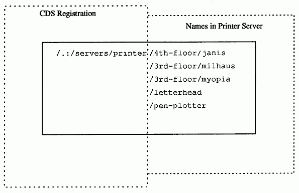 The following figure shows the example of a printer server that is registered with CDS, with printers that are not. The ACL manager for the printer server uses the dce_acl_resolve_by_name( ) resolution routine to obtain the UUIDs of the several printers that are supported. The administrator in charge of the printers can change the printers, their names, and their ACLs without concern for registering them with CDS.