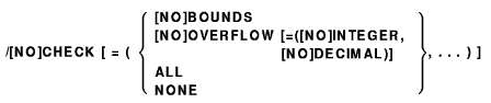 /[NO]CHECK [ = (check-clause,...) ] /CHECK=(BOUNDS,OVERFLOW)